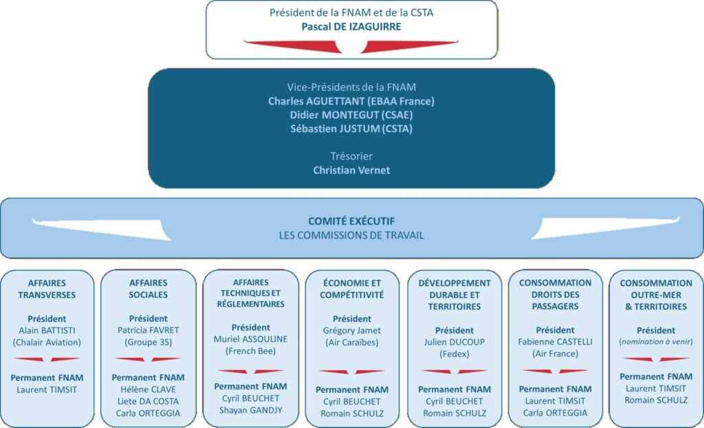La FNAM, principale organisation professionnelle du secteur aérien, représente plus de 95 % du transport aérien. Au travers de 7 groupements professionnels dont la CSTA (Chambre Syndicale du Transport Aérien) et la CSAE (Chambre Syndicale de l’Assistance en Escale), elle fédère 9 métiers et représente plus de 370 entreprises (soit plus de 100 000 emplois dont 65 000 emplois dans les compagnies aériennes et 15 000 dans l’assistance en escale et gestionnaire d’aéroports. Par ailleurs les autres secteurs comptent pour près de 20 000 emplois.)